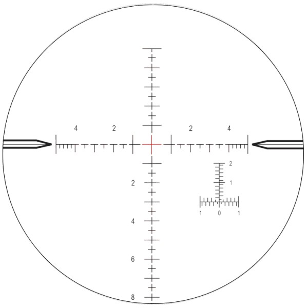 *Le réticule Mil-RT permet une télémétrie et des contre-visées précises pour un placement du premier coup efficace et des coups à suivre rapides. La croix centrale flottante mesure 1,0 Mil et est complétée par des repères de 1, .5, .2 et .1 . Ce rétciule est illuminé seulement en son centre et possède une échelle de 15 Mil-radian en dessous du centre.
